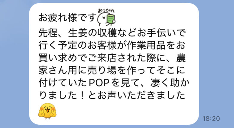 内容は、「生姜の収穫に行かれるお客さまが作業用品をお買い求めになった際に、『すごく助かりました!』と声をかけてくださった」というご報告。